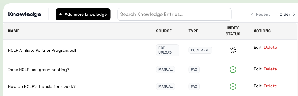 Once saved, your new entry appears in the Knowledge list. If it’s your first, you’ll only see one entry here. Use the + Add more knowledge button to keep building. Over time, this page will grow into a library that HOLP can draw from.