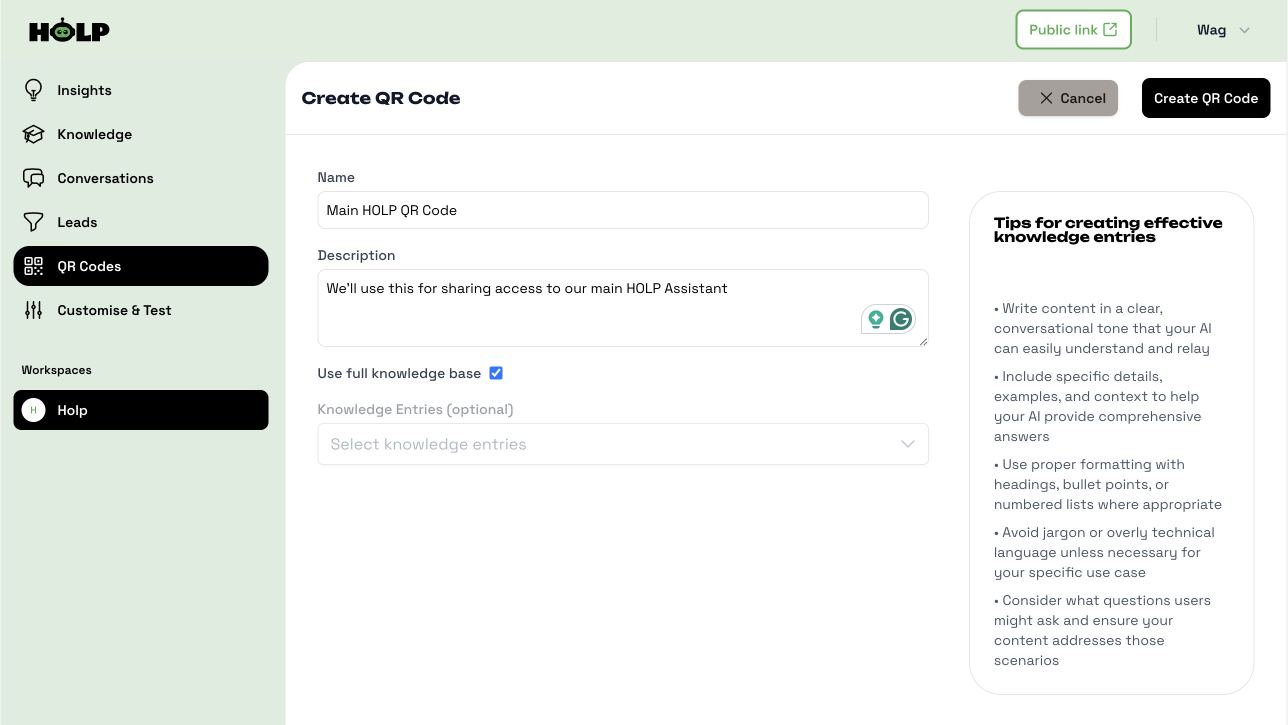 If you want the QR code to give access to your entire assistant, keep Use full knowledge base selected. This means anyone scanning the code can ask any question HOLP is trained on, not just a single topic.