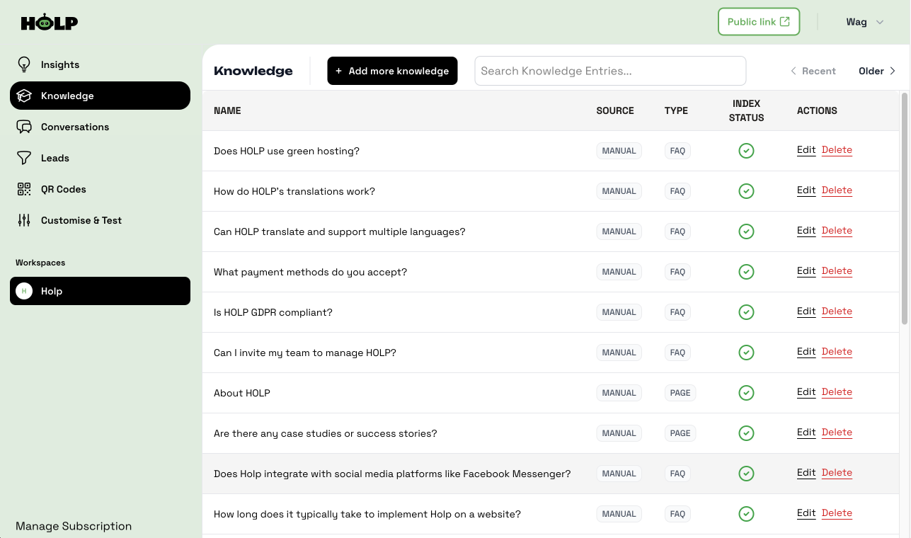 That’s it! By keeping an eye on the Conversations area and updating your knowledge base regularly, you’ll ensure HOLP keeps getting smarter and more helpful for your customers.