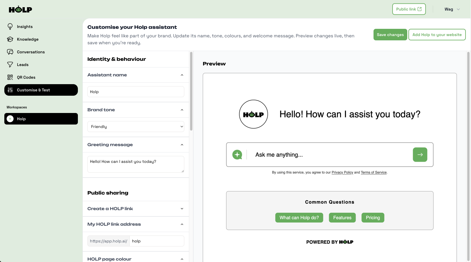 You can also test HOLP directly here by asking questions — a great way to see how your tone and greeting feel in action.