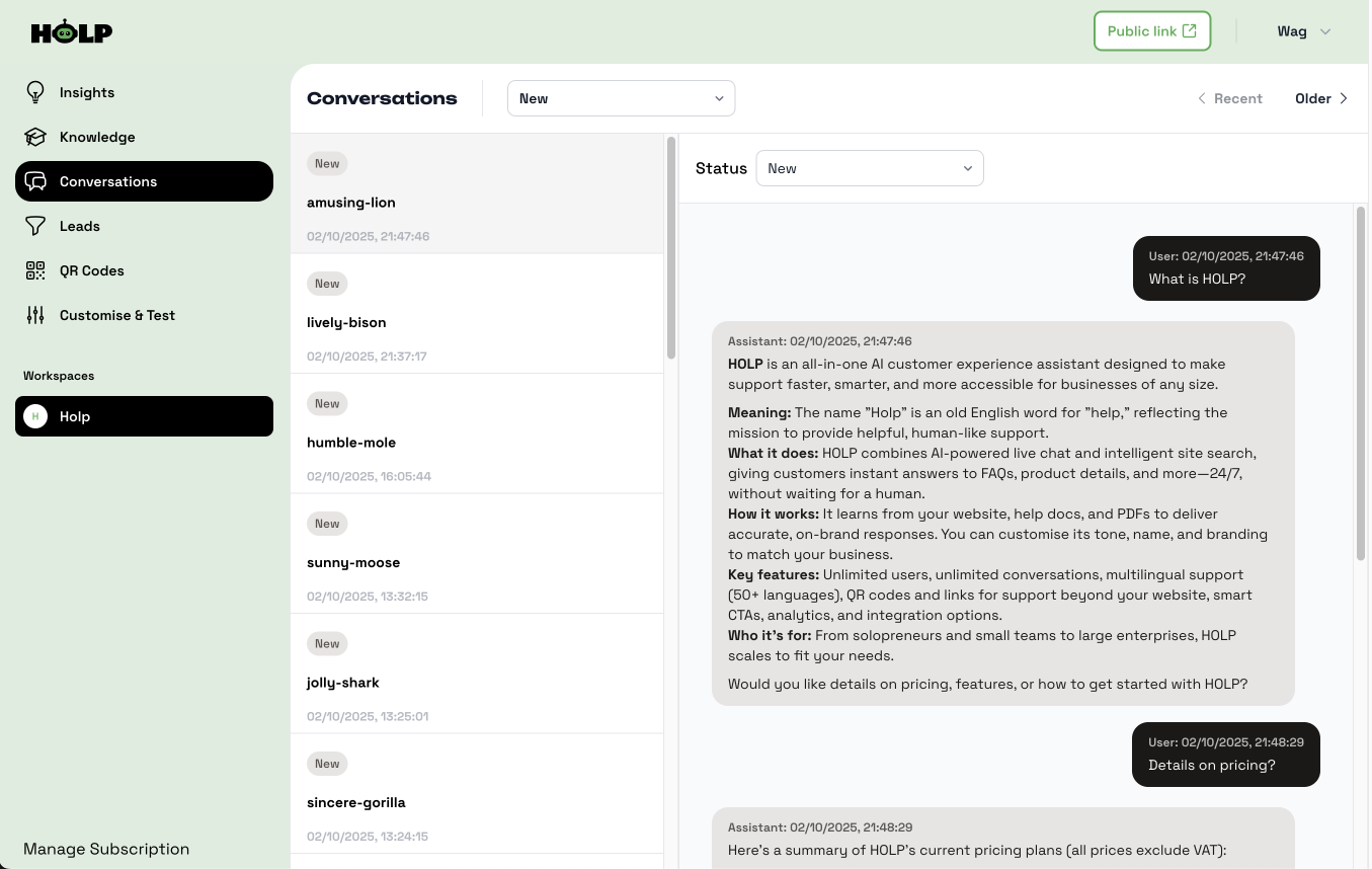 Review conversations → See exactly what questions people are asking and how HOLP responded.