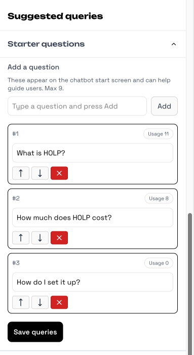 Add up to 9 starter questions. These appear in the Common Questions section underneath the chat field. They help guide people and spark interaction. For example: